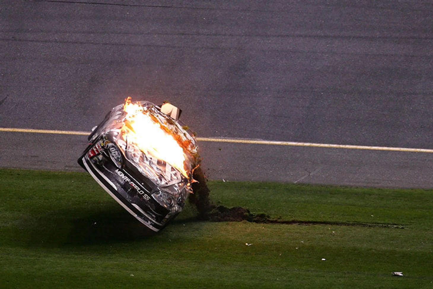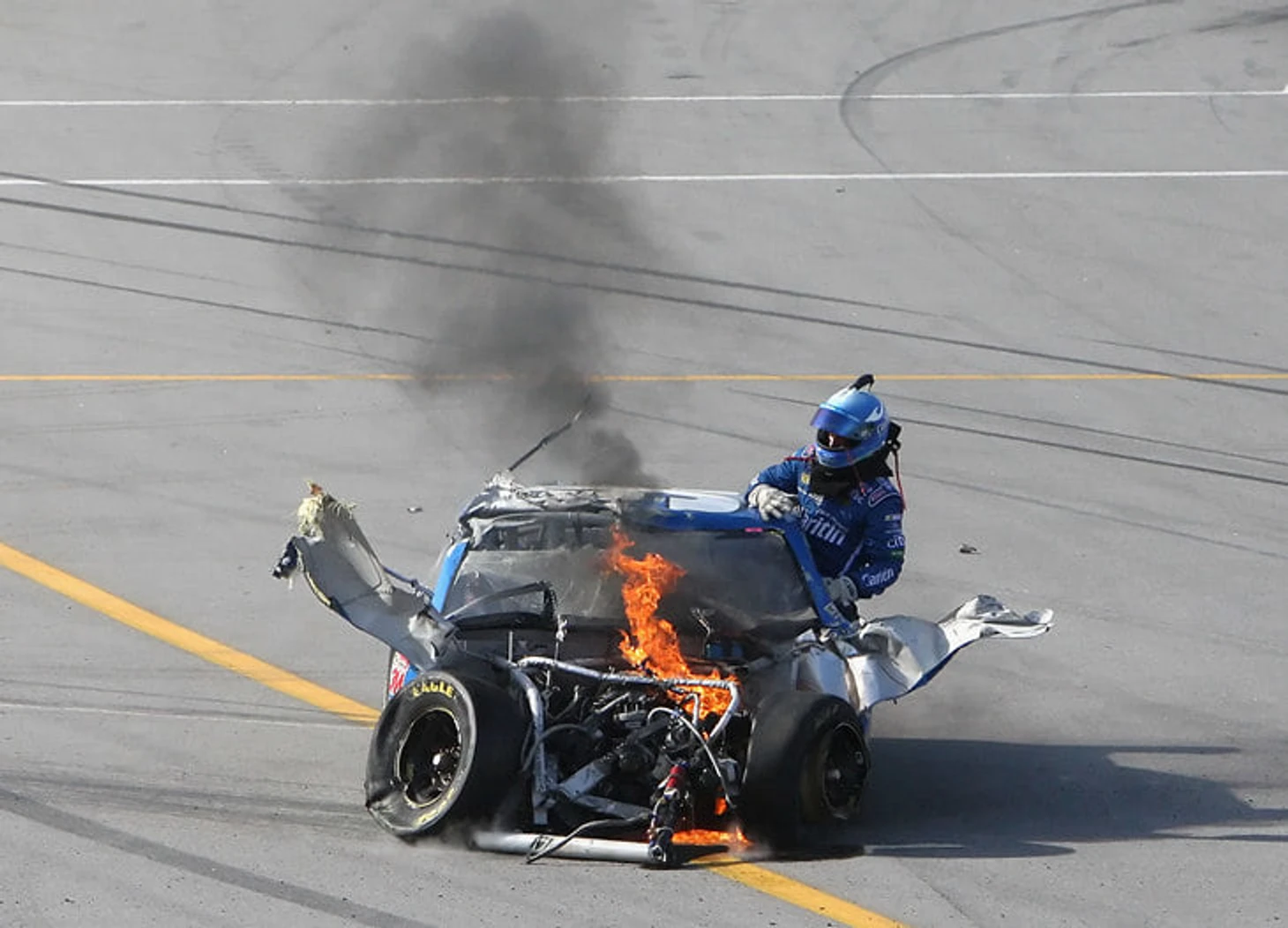 А это NASCAR и легендарная «Дайтона-500» 2007 года. Клинт Бойер очень удачно перевернулся и разбил все, что только можно — в том числе и мотор со всеми баками.