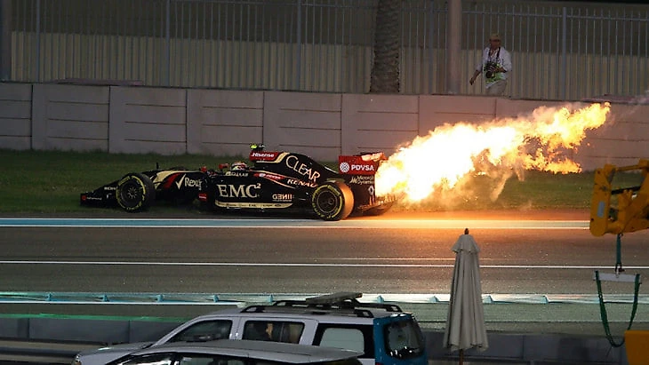 Здоровенный огненный хвост из «Лотуса» Пастора Мальдонадо на Гран-при Абу-Даби 2014 года появился из-за механического износа мотора.