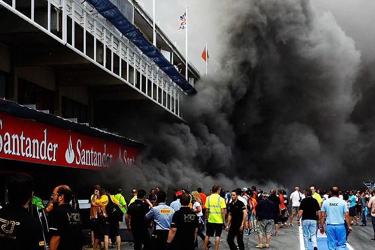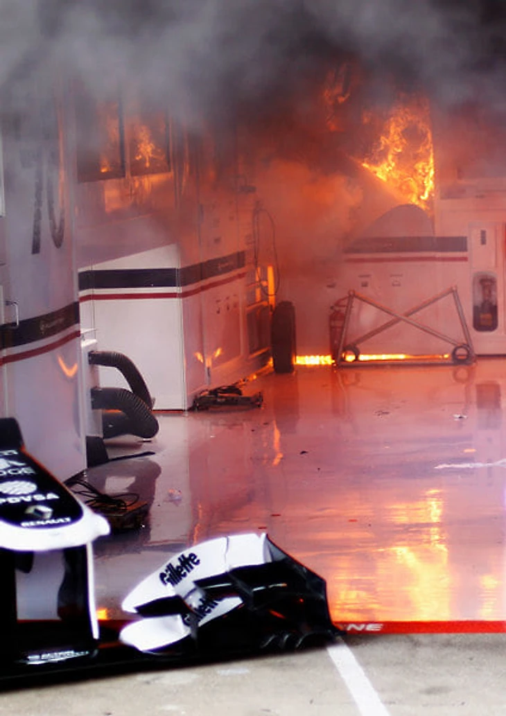 А иногда болид может загореться даже в боксах – как, например, машина Бруно Сенны на Гран-Испании 2012 года. У нее всего лишь отказала система рекуперации энергии KERS – и короткое замыкание привело к яркому результату.