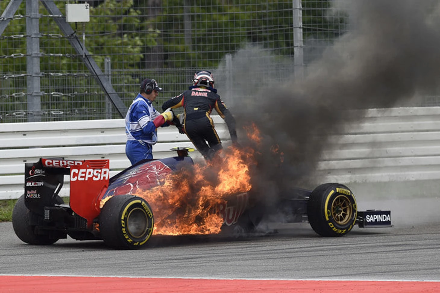 Убегать пришлось и Даниилу Квяту на Гран-при Германии 2014 года – система зажигания отказала и направляла топливо сразу в выхлопную систему.