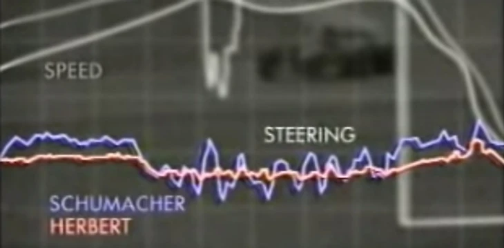 На входе в поворот линия очень плавная, но в середине поворота по зигзагам видно — Шумахер делает огромное количество коррекций, поправляя мелкие проскальзывания машины. Они нечасто видны по трансляции или на треке.