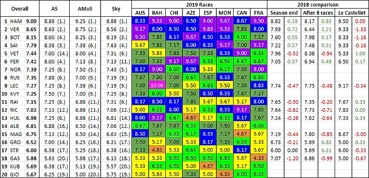 Первая графа — средняя оценка трех изданий за сезон, вторая — баллы от Autosport за сезон, третья — от Auto Motor und Sport за сезон, четвертая — от Sky Sports за сезон. Графа FRA– среднее арифметическое от изданий по результатам Гран-при Франции.