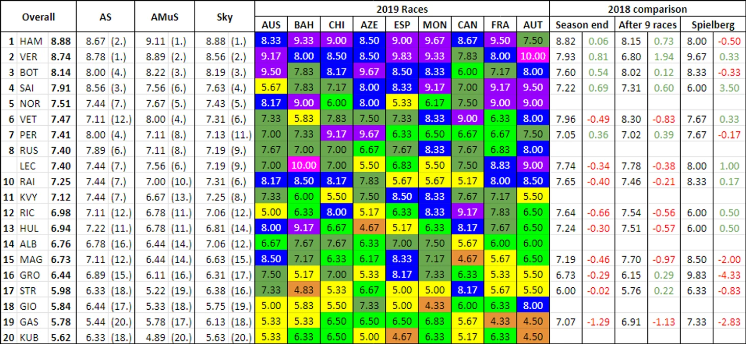 Первая графа — средняя оценка трех изданий за сезон, вторая — баллы от Autosport за сезон, третья — от Auto Motor und Sport за сезон, четвертая — от Sky Sports за сезон. Графа AUT– среднее арифметическое от изданий по результатам Гран-при Австрии.