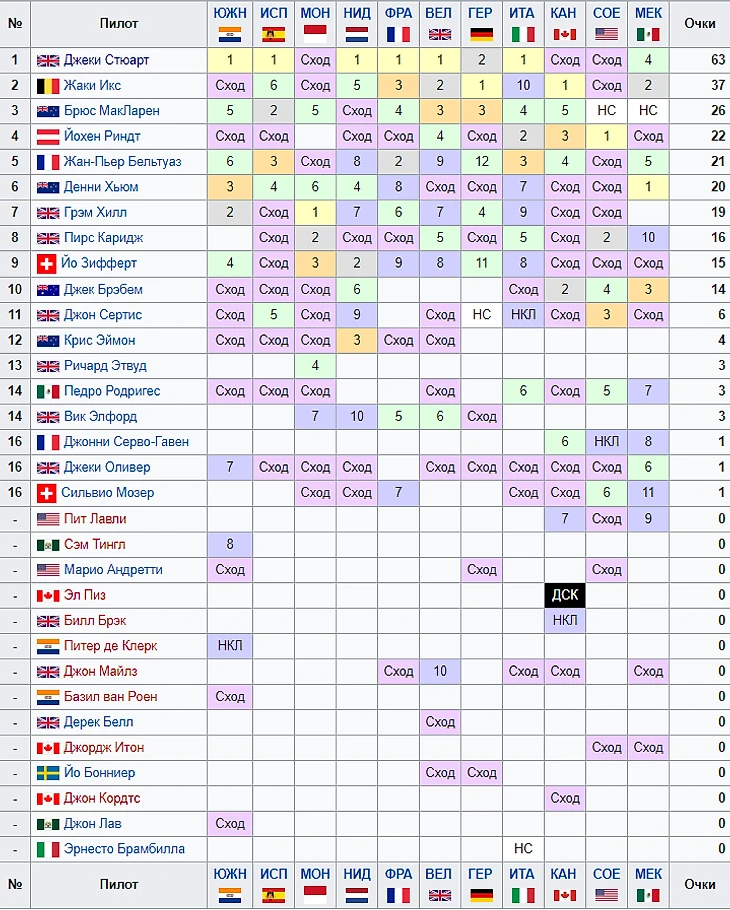 Кен Тиррелл позаботился о лучших экземплярах моторов «Косворт» и новых, более «полных в талии» монококах «Матра», которые обеспечивали лучшее распределение веса от топлива в баках. «Данлоп» разработал шины, конкурентоспособные почти на всех трассах. Преимущество шотландца было еще более очевидным по причине провала «Лотус» в этом сезоне. Колин Чэпмен сделал революционные выводы из прошлого дождливого сезона и опыта гонок в Индианаполисе. Он думал, что перспективным решением всех проблем является полный привод и создал клинообразный «Лотус 63». Это произведение искусства было оснащено расположенными внутри дисками тормозов и весило 545 кг, однако дополнительные шестерни для передачи усилия на переднюю ось отбирали чересчур много мощности у 430-сильного «Форд- Косворт».