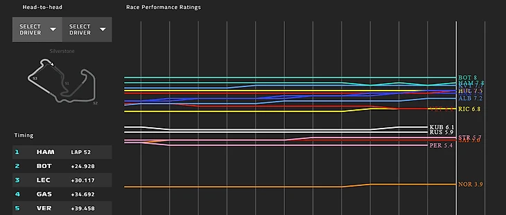 На официальном сайте «Формулы-1» в разделе лайвтайминга на странице «выступлений» появились оценки пилотам за Гран-при Великобритании, основанные на данных телеметрии.