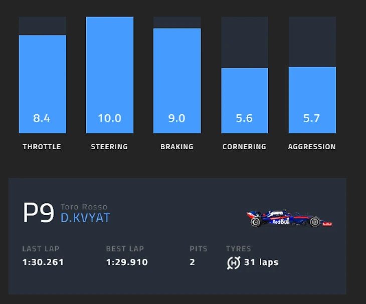 Третий результат второй раз подряд Даниил Квят из «Торо Россо». Его оценка в 7,7 сложилась из 8,4 за работу с педалью газа, 10 за работу рулем, 9 за работу на торможениях, 5,6 за прохождение поворотов и 5,7 за «агрессивность». Даниил стартовал 17-м, но поднялся на 8 позиций и финишировал в очках. К слову, он в очередной раз (уже в пятый из 10 гонок) стал лучшим в пелотоне по работе рулем.
