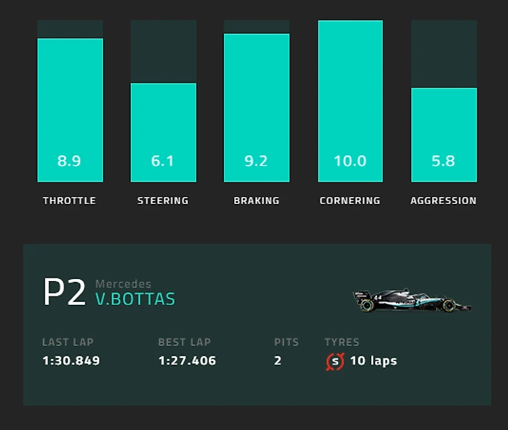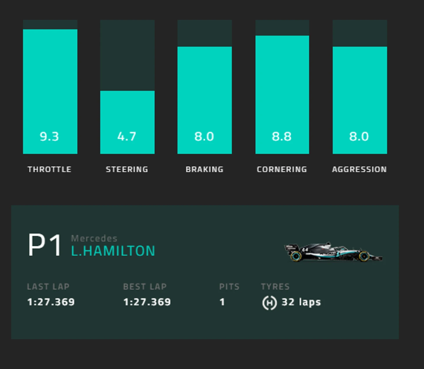 В соответствии с ними лучше всех пилотировал обладатель поула Валттери Боттас из «Мерседеса» — его оценка в 8,0 сложилась из 8,9 за работу с педалью газа, 6,1 за работу рулем, 9,2 за работу на торможениях, 10 (максимальный балл) за прохождение поворотов и 5,8 за «агрессивность». Валттери отбился на трассе от напарника Льюиса Хэмилтона в начале гонки, но из-за выезда автомобиля безопасности оказался на втором месте и просидел на нем до финиша.