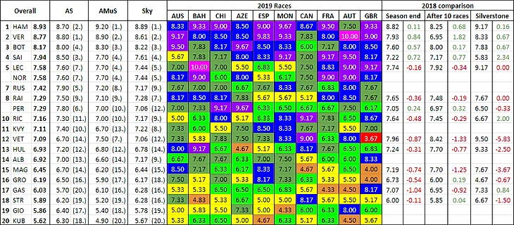 Первая графа — средняя оценка трех изданий за сезон, вторая — баллы от Autosport за сезон, третья — от Auto Motor und Sport за сезон, четвертая — от Sky Sports за сезон. Графа GBR– среднее арифметическое от изданий по результатам Гран-при Веоикобитании.