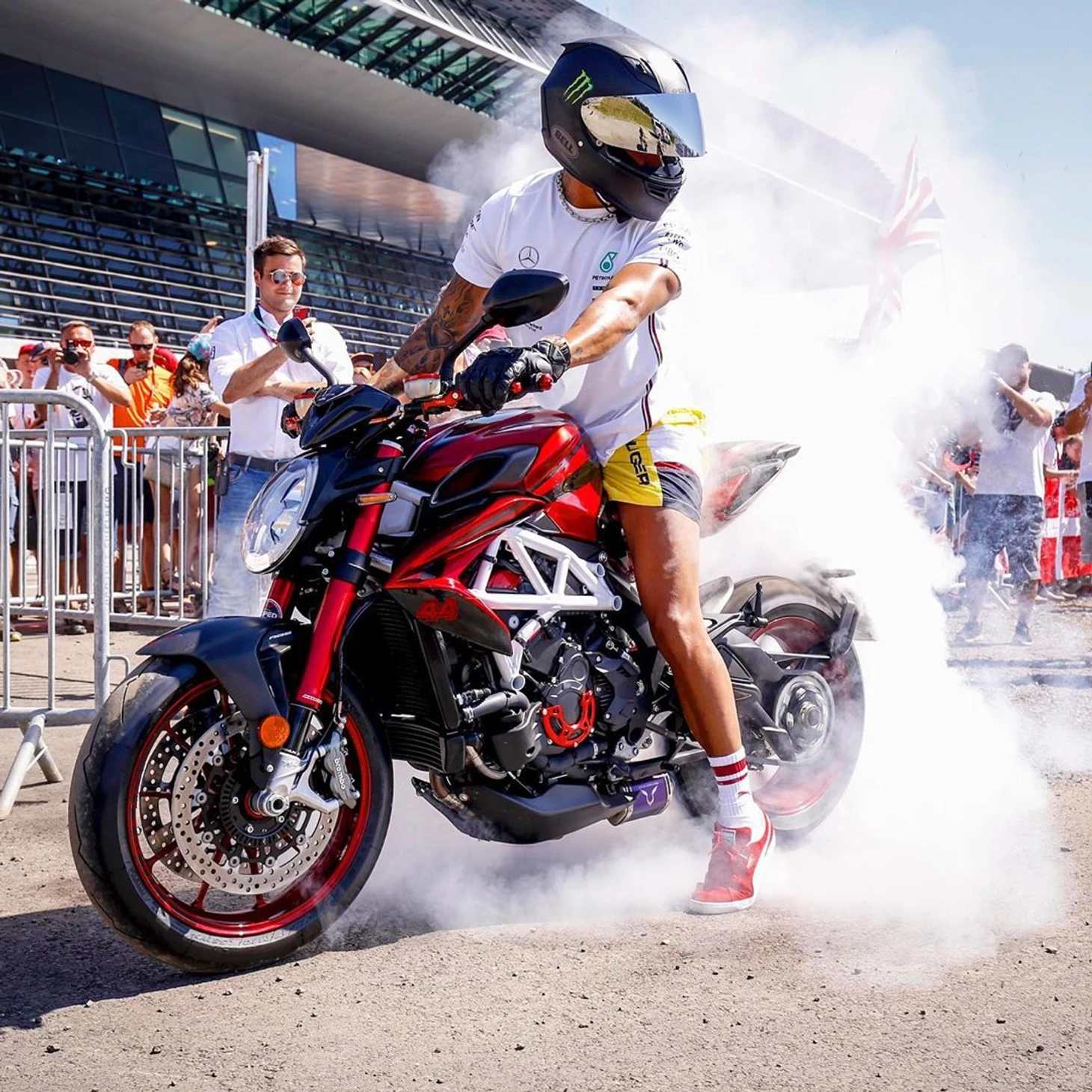 Льюис Хэмилтон на все Гран-при приезжал на кастомном байке MV Agusta F4 LH44 – 212 л.с., 302 км/ч максималки и 73 тысячи долларов за экземпляр.