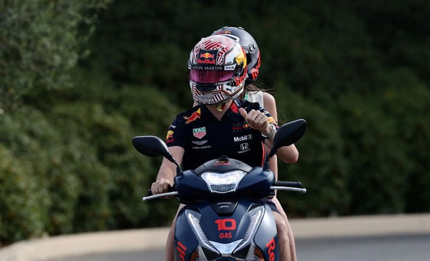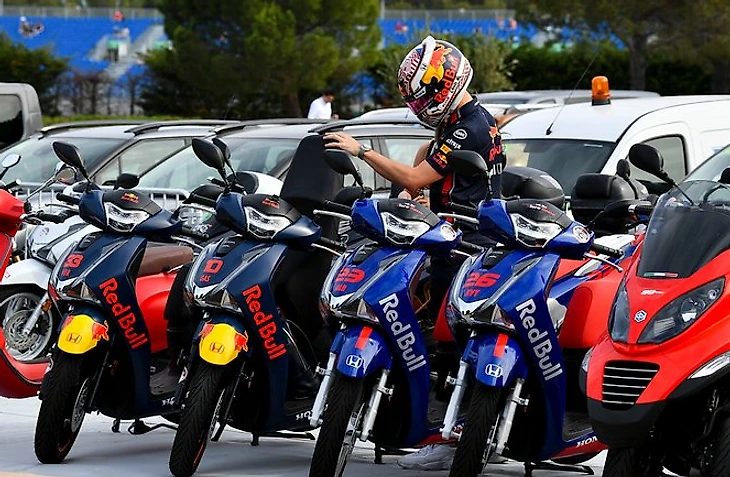 Напарник Ферстаппена Пьер Гасли гонял на корпоративном скутере и даже катал на нем свою девушку.