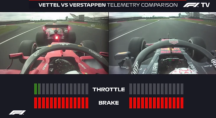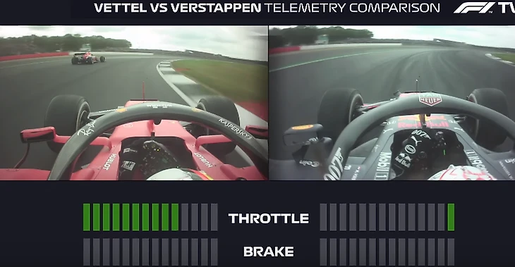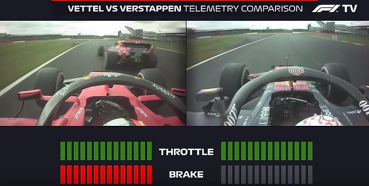 Если мы замедлим повтор, то увидим: Феттель тормозил даже раньше Ферстаппена — сразу как увидел, что Макс захлопывает калитку целиком, и шанса войти на внутреннюю траекторию не будет».