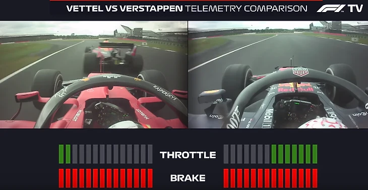 Но когда они подъезжают к зоне торможения, то давят на педаль почти в одно и то же время. Вот только Себ находится в «грязном воздухе» Макса — у него намного меньше прижимной силы, а значит, увеличивается и тормозной путь.