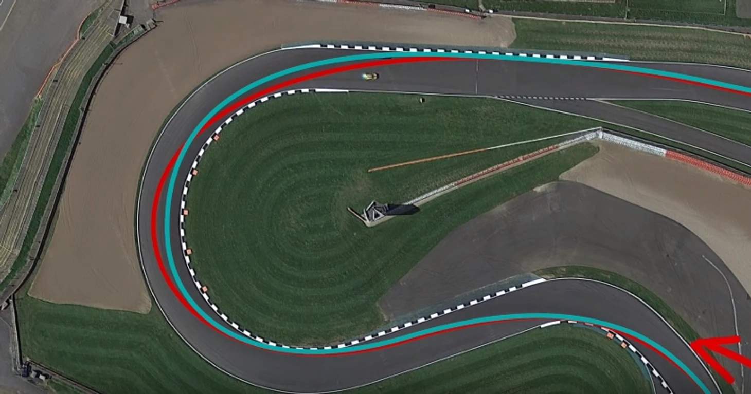 (Сравнение с Хэмилтоном. Бирюзовая линия — траектория Льюиса, красная — траектория Феттеля)