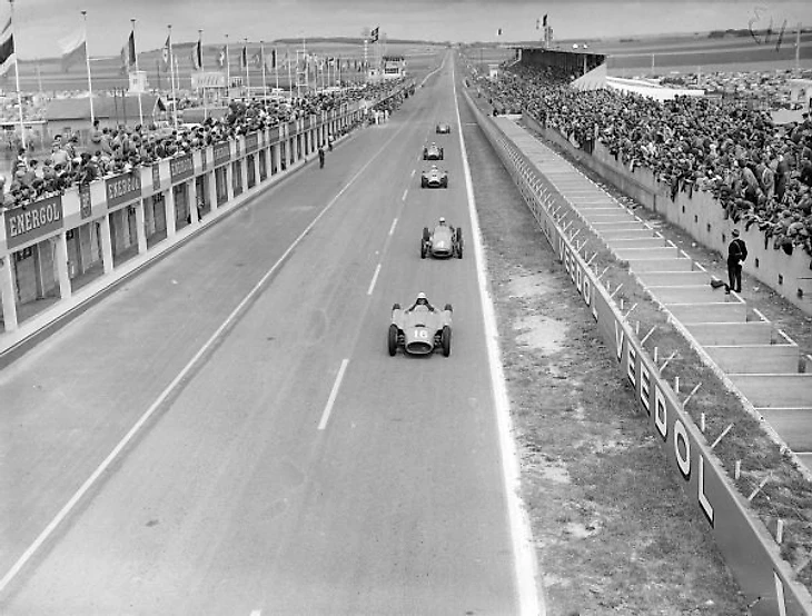 Гран-При Франции 1956, Альфонсо де Портаго (Ferrari D50) впереди Жана Бера (Maserati F250), Оливье Жендебьена (Ferrari D50) и Стирлинга Мосса (Maserati F250).