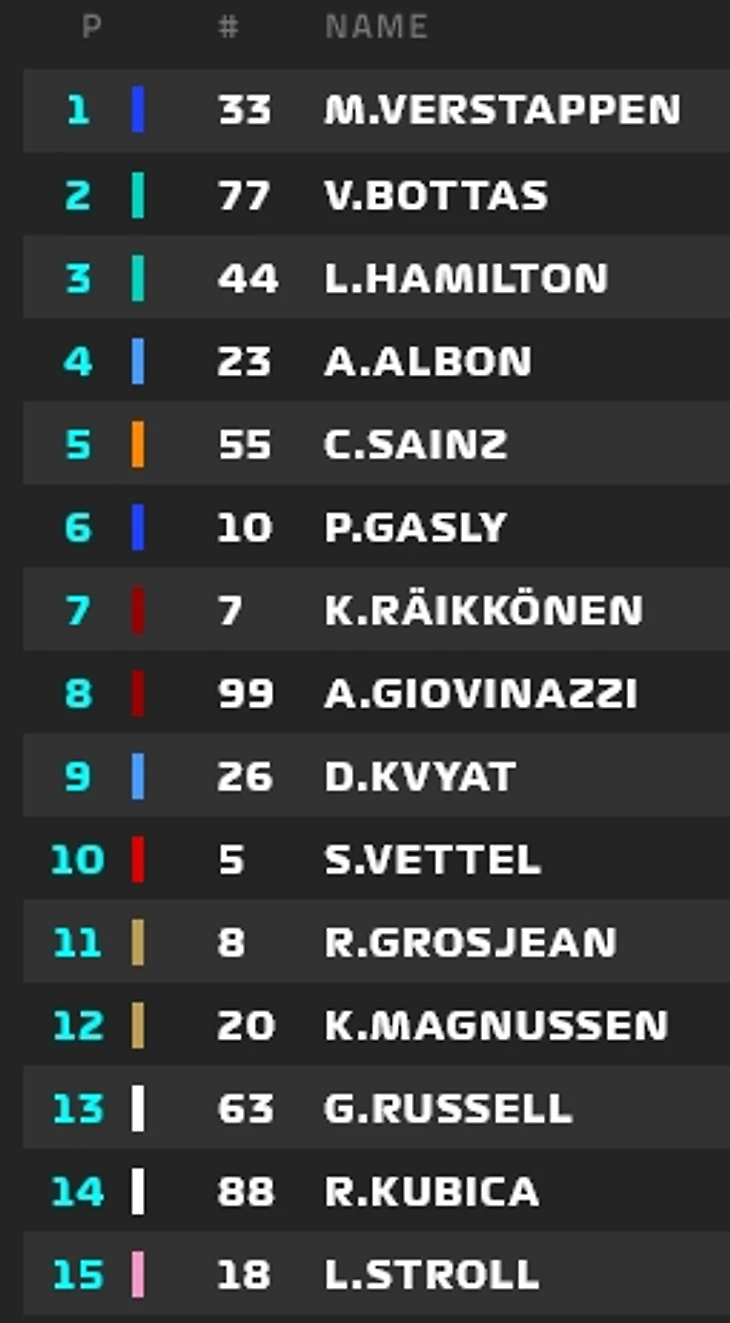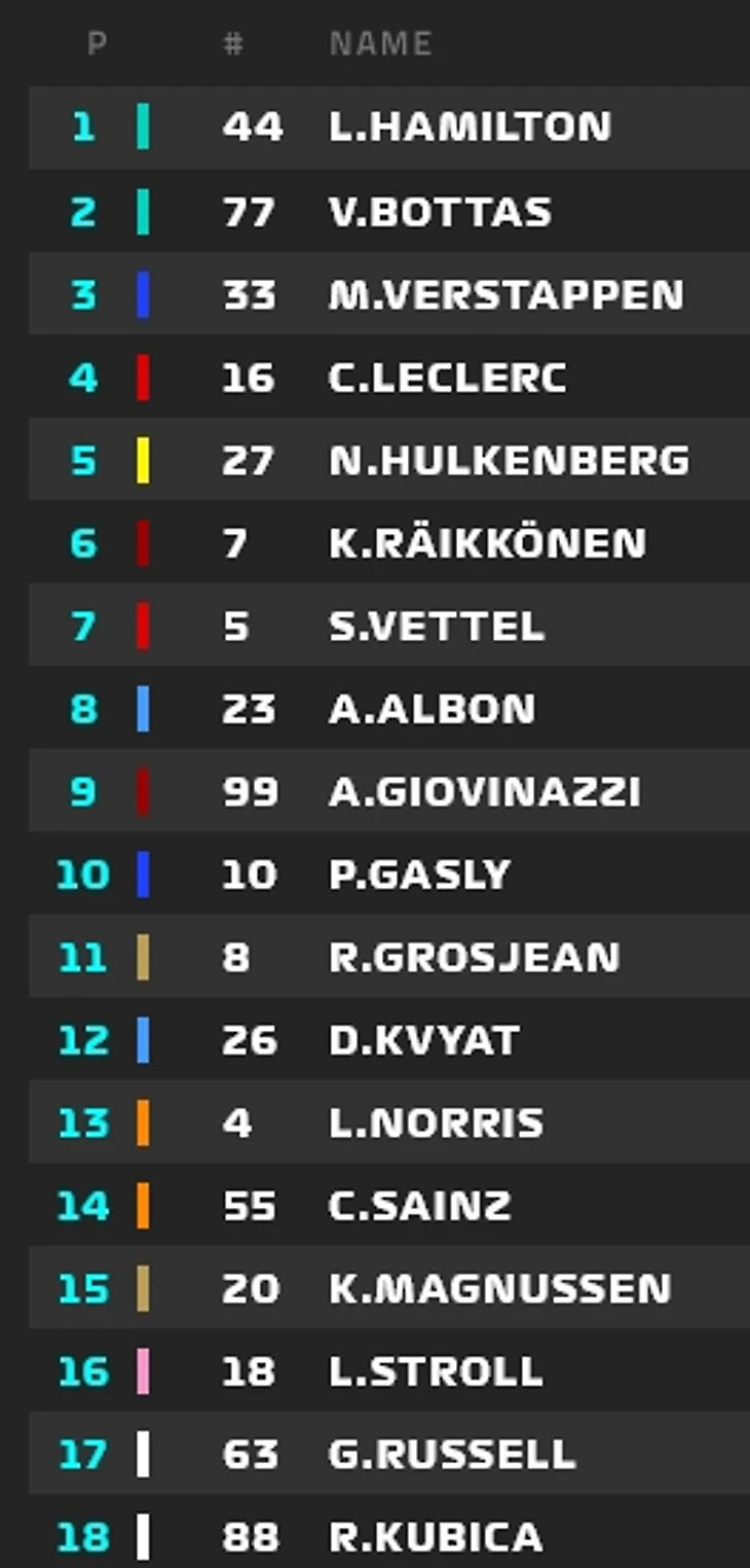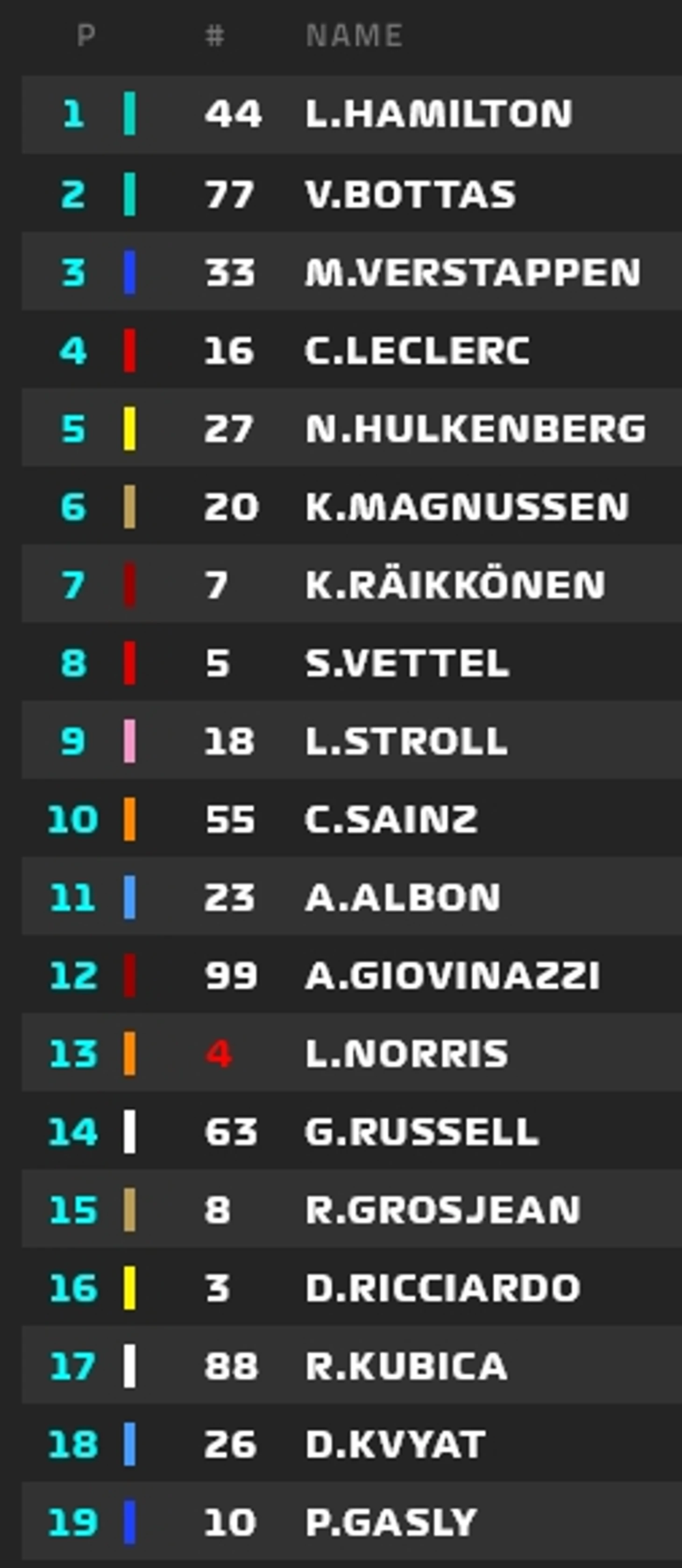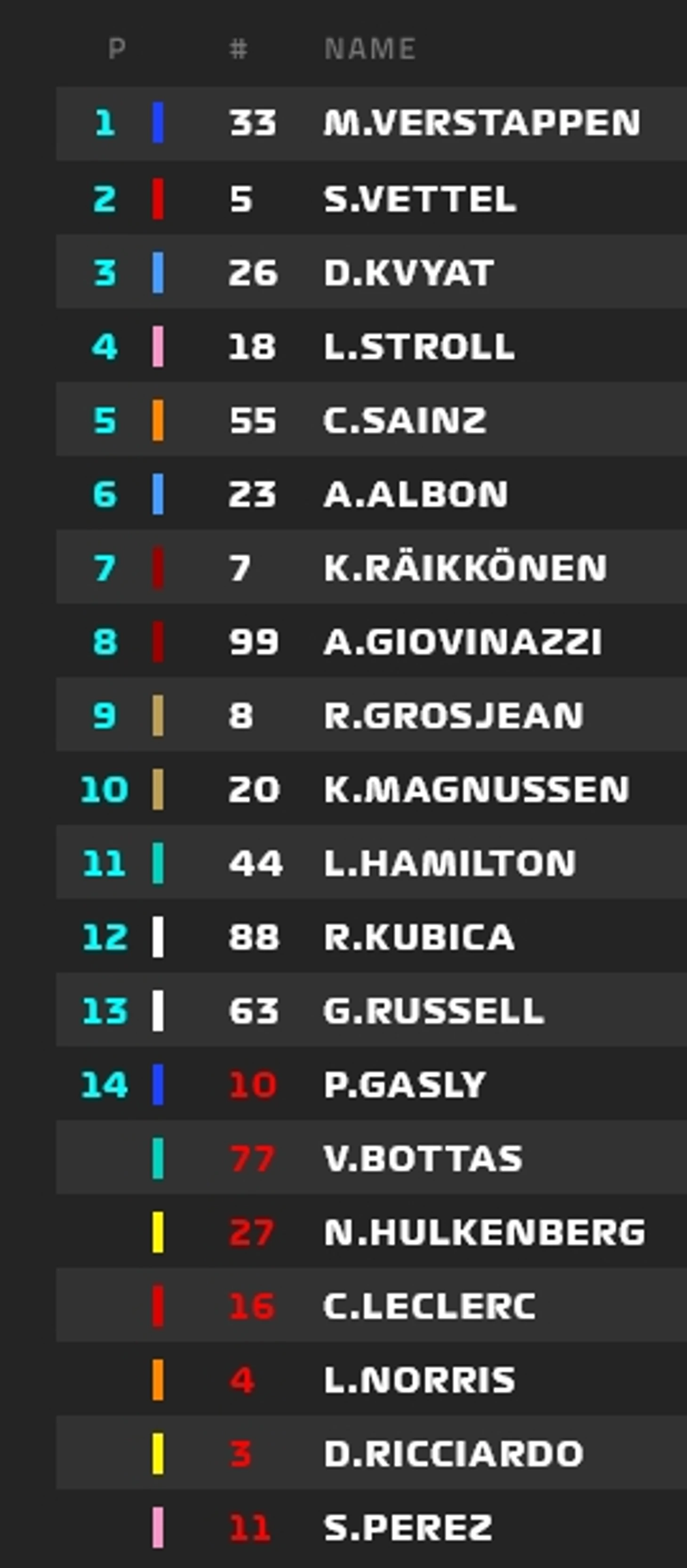 16:20 Старт! На трассе настоящий хаос – Хэмилтон сохранил лидерство, Райкконен – третий! Гасли отвалился на 8-е место! Леклер прорвался уже на 6-е место, а Феттель – на 14-е!