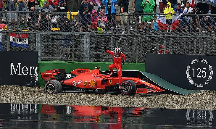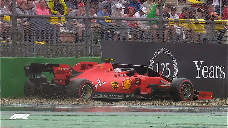 Шарль Леклер в первый раз успел отловить машину, но несколько кругов спустя уже был пассажиром на скользком асфальте:
