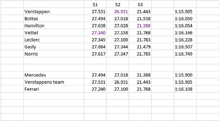 15:40 На реддите свели в таблицу лучшие сектора пилотов «Ред Булл», «Мерседеса» и «Феррари», на основе чего вывели их потенциальные времена в квалификации. Как видите, «серебряные стрелы» и «быки» в лице Ферстаппена абсолютно на равных. Гасли на реддите вообще не котируют.