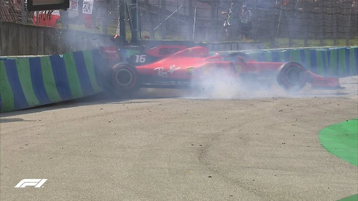 16:11 Леклер ошибся на выходе из последнего поворота – разворот, удар в стену и сломанное заднее антикрыло! В первом сегменте он вряд ли уже выедет, хотя он и так уверенно проходит дальше.