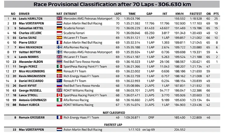 В середине гонки Макс Ферстаппен начал жаловаться что его софт теряет сцепление с трассой. В это время Мерседес и Льюис Хэмилтон пытались обмануть Ред Булл, постоянно выходив на пит-стоп, однако Льюис не заезжал. В итоге свежий хард на болиде Ферстаппена был быстрее, чем изношенный софт на болиде Хэмилтона. Мерседес предпринял тактику с 2 пит-стопами и она сработала.