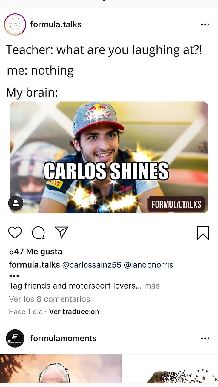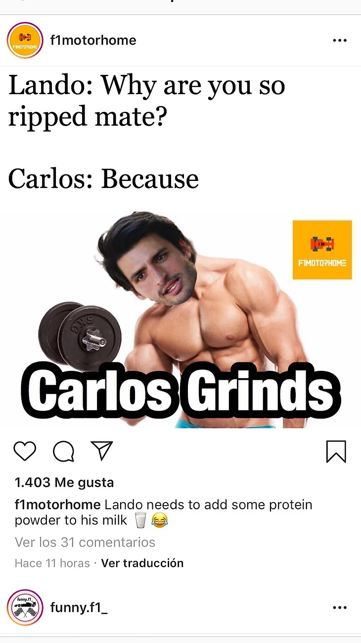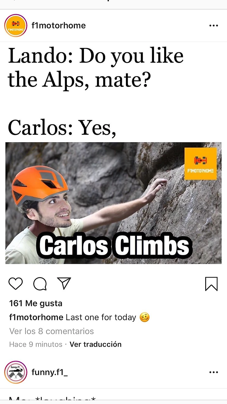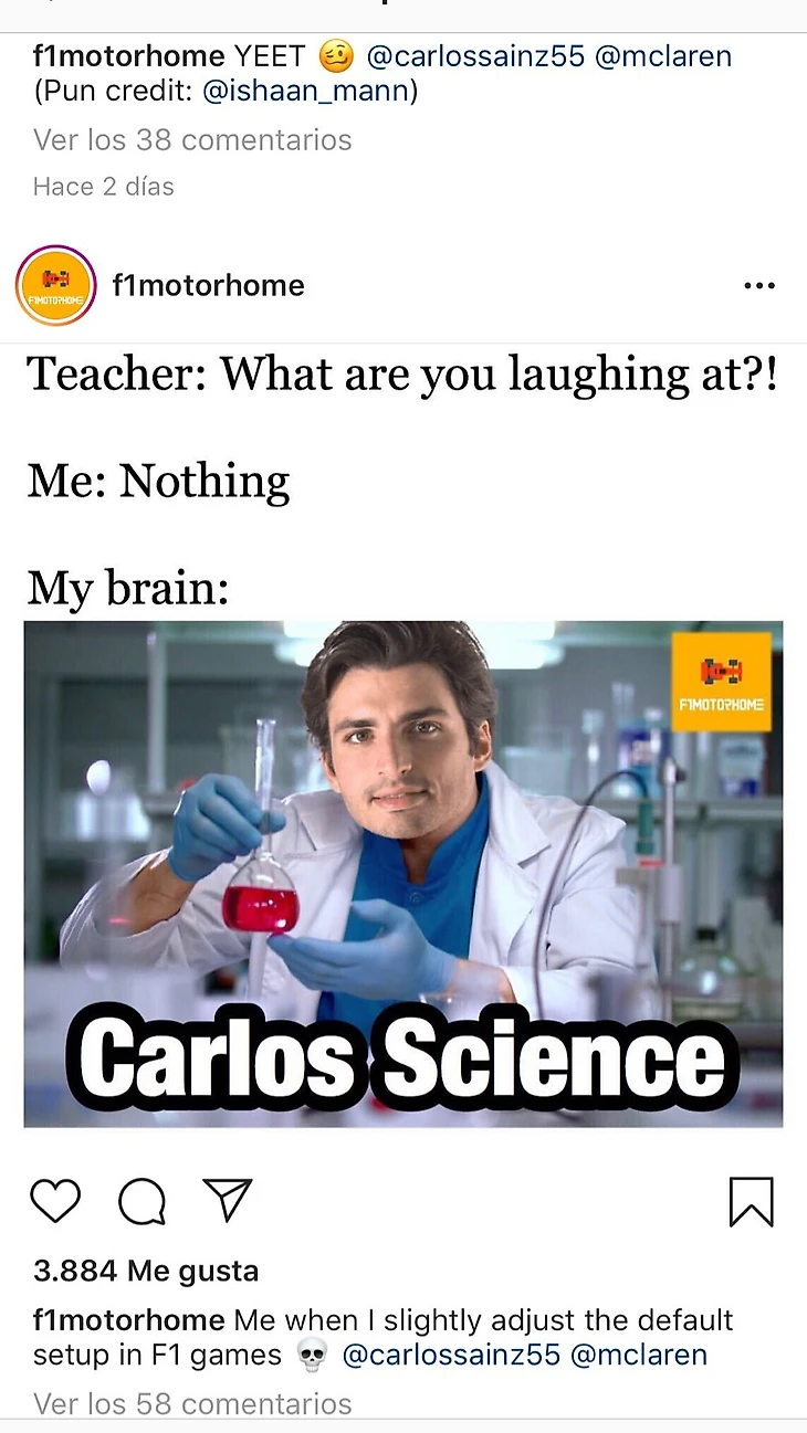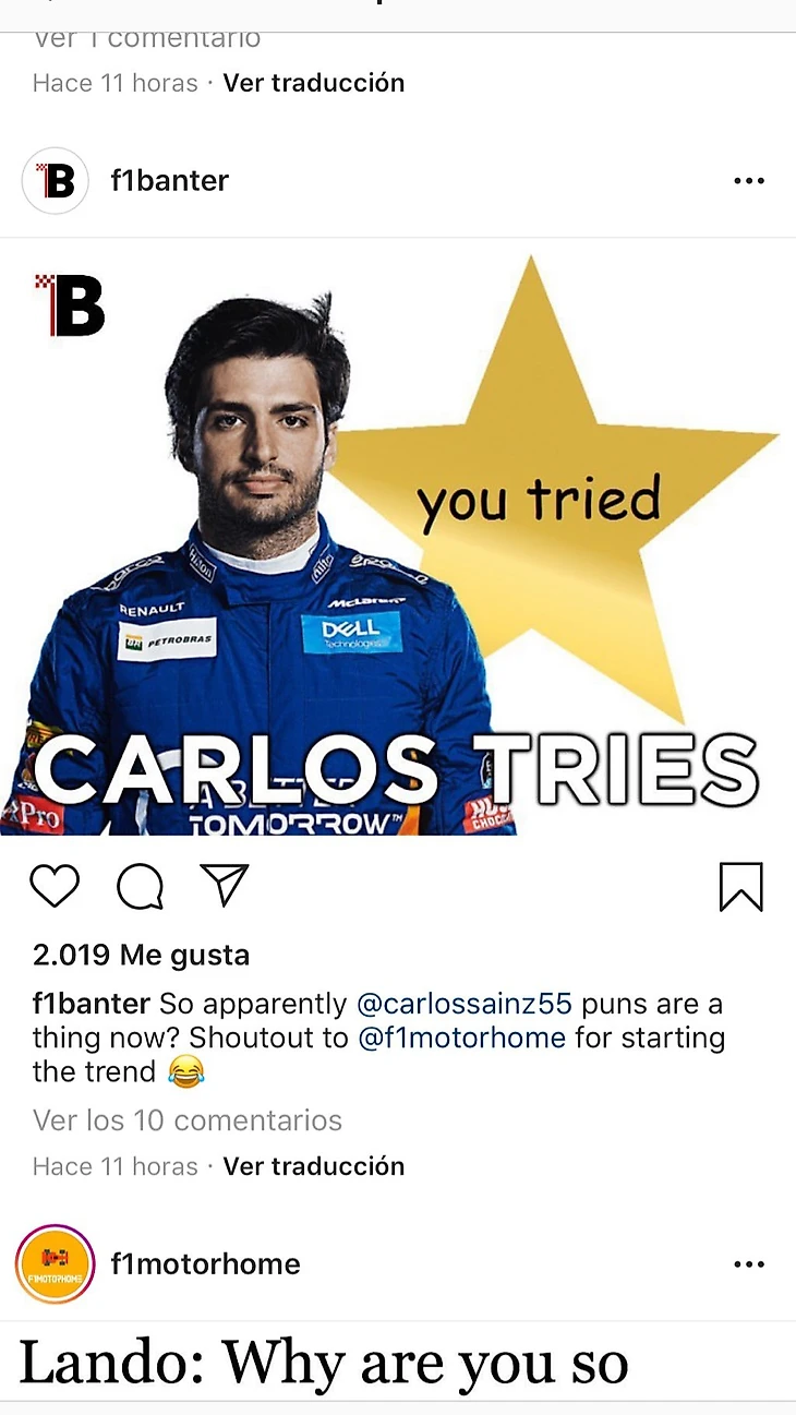 Сейчас в «Макларене» выступают гонщики с самым ярким чувством юмора в пелотоне — даже Даниэлю Риккардо и Кими Райконнену не всегда удается соответствовать. Сперва образ лорда мемов взялся на себя новичок «Ф-1» Ландо Норрис, но, как выяснилось, его напарник Карлос Сайнс относится к этому ничуть не хуже.