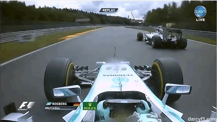 Теперь с бортовой камеры. Никто не может сказать, что Льюис не знал точно, где был Росберг. В этот момент, если Хэмилтон дает ему место, у Росберга есть шанс на обгон, потому что следующий поворот левый, поэтому, как и любой гонщик, он идет на это.