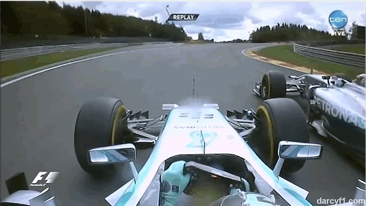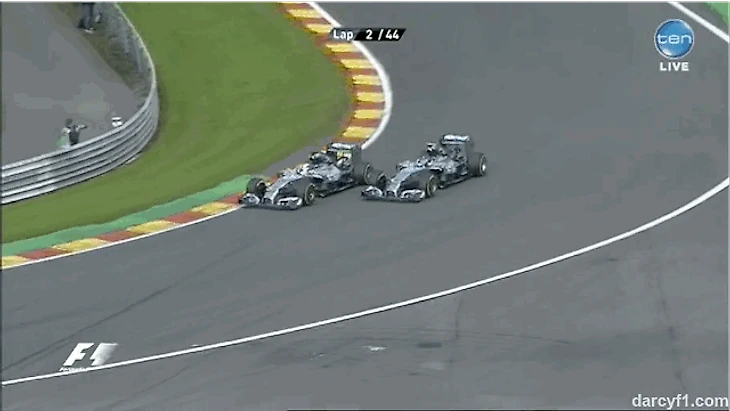 Теперь средняя часть поворота. Энтони Дэвидсон пытался доказать, что коррекция рулем является доказательством умышленно столкновения Росберга с Хэмилтоном. Привет sky, где Льюис является их любимчиком. Смешно, ясно, что Росберг просто испытал избыточную поворачиваемость, и когда он вернулся, то Хэмилтон уже уехал вперед. Можно утверждать, что Росберг допустил ошибку и потерял заднюю часть болида, но даже если бы он этого не сделал, а Хэмилтон придерживался той же линии, они бы коснулись. Оба поехали по одной и той же траектории. Ни один из них не желал уступать. Классический гоночный инцидент.