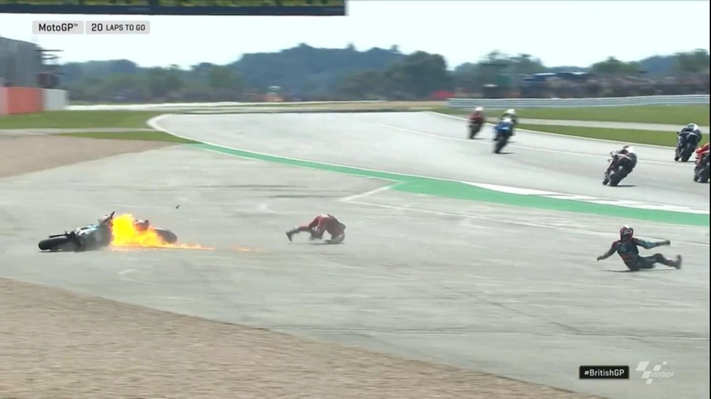 Однако старт готовил сюрприз. Гонщик «Ямахи» Фабио Куартараро допустил ошибку уже в первом же повороте, потеряв над мотоциклом контроль. На упавшего француза наехал «Дукати» Андреа Довициозо. Мотоцикл итальянца резко подбросило вверх и тут же загорелся. Андреа жестко приземлился на спину, совершил несколько перекатов, а после долго лежал на земле.
