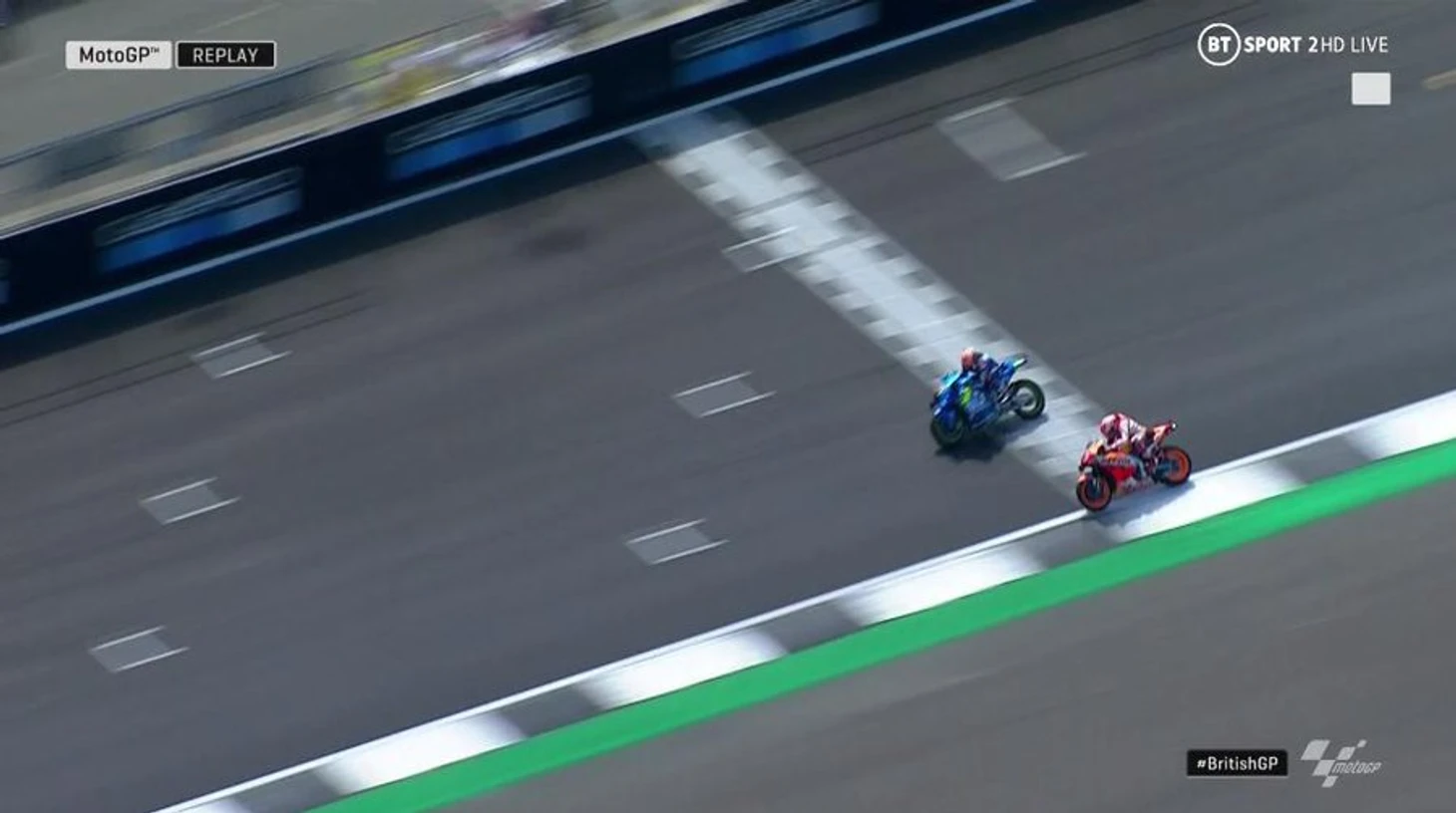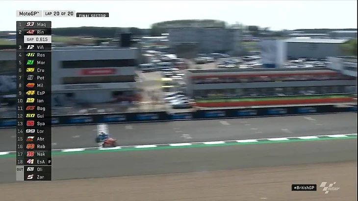 Марка Маркеса в этом сезоне практически не остановить. В Великобритании он повторил рекорд по количеству подиумов в истории MotoGP – 88. Однако испанец занял второе место, лидировав всю гонку. С первого круга его главным соперником стал его соотечественник Алекс Ринс на «Сузуки». Их борьбу можно описать следующим образом: У Марка за счет мощной «Хонды» было преимущество на прямых, в то время как Ринс отыгрывал время в поворотах. В свое время это сыграет ключевую роль в гонке.