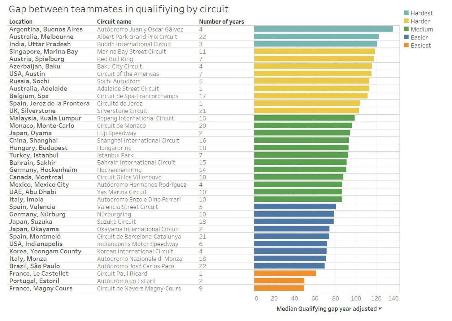 В рамках этой идеи аналитик рассчитал разницу в квалификационных результатах между финальными попытками напарников и на каждом треке в каждом сезоне, начиная с 1994 года, и средней разницей в конкретном в конкретном сезоне (необходимо для того, чтобы учитывать внутренние перемены в «Формуле-1»: новое покрытие на треках, новый регламент и так далее; также разрывы сильно снизились по сравнению с 90-ми естественным образом). Затем общий результат для треков формировался как среднее значение полученного процента за все годы присутствия в календаре «Ф-1» за последние 25 лет.
