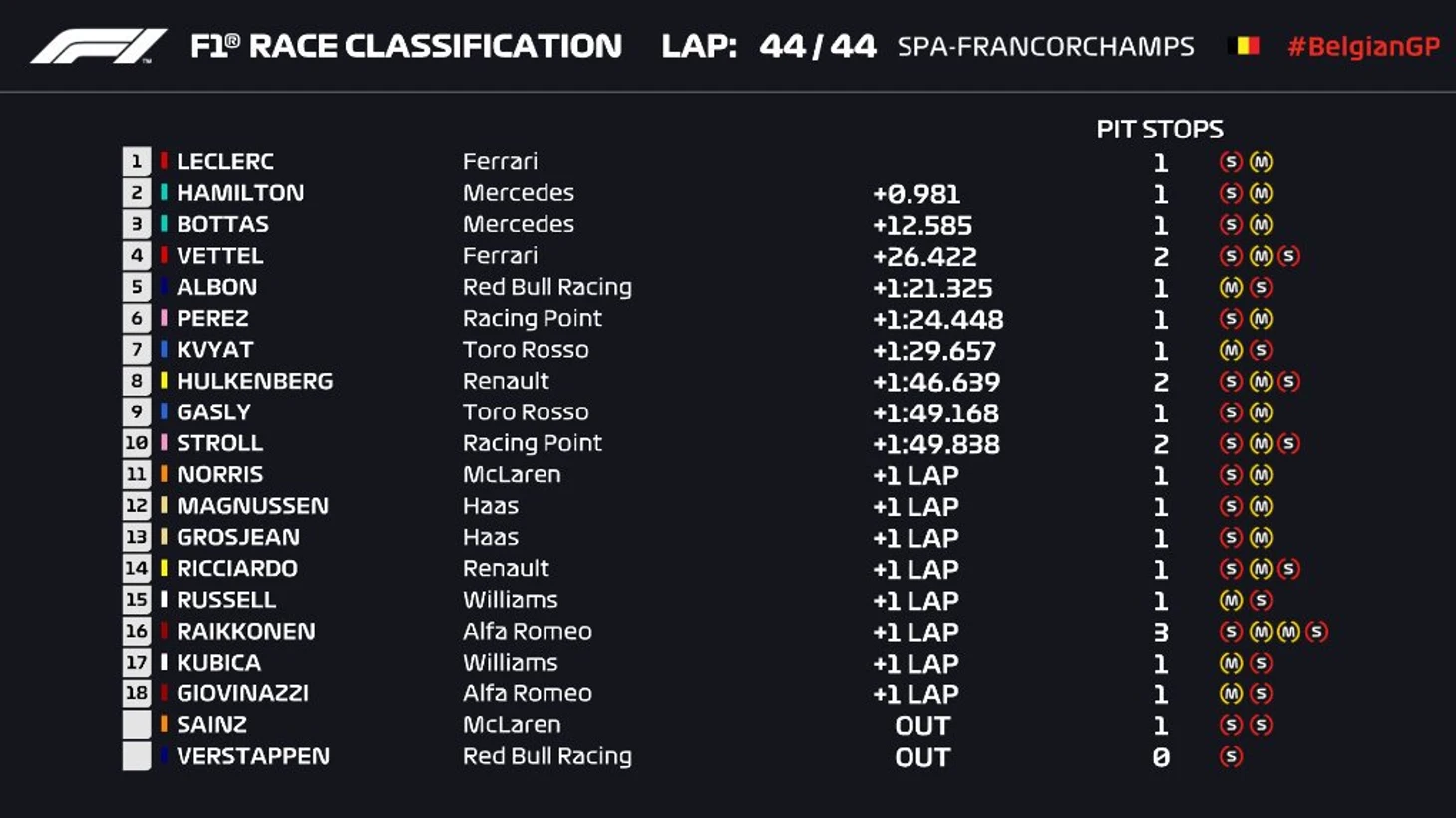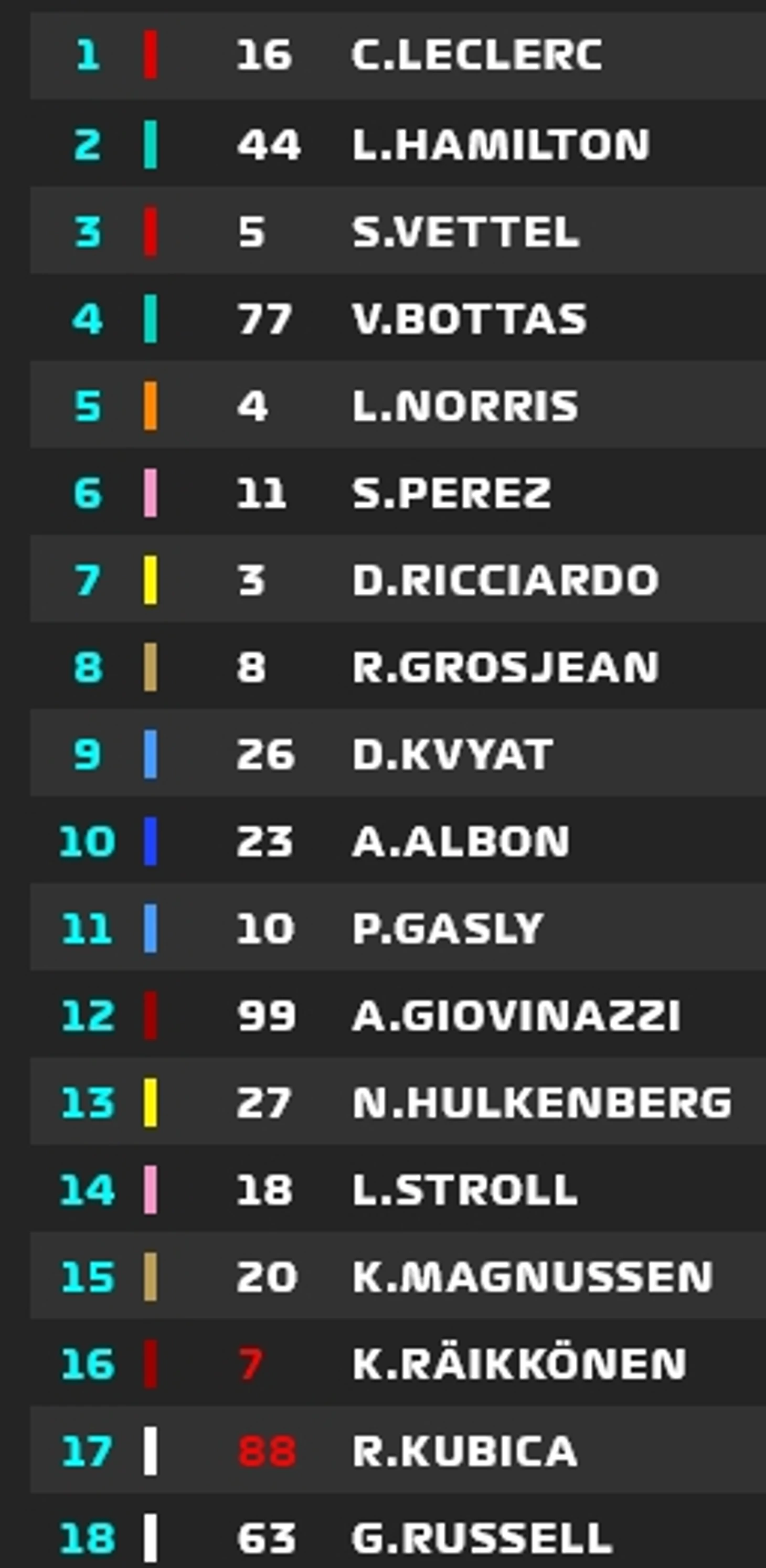 1. Шарль Леклер («Феррари»)2. Себастьян Феттель («Феррари»)3. Льюис Хэмилтон («Мерседес»)4. Валттери Боттас («Мерседес»)5. Макс Ферстаппен («Ред Булл»)6. Кими Райкконен («Альфа Ромео»)7. Серхио Перес («Рейсинг Пойнт»)8. Кевин Магнуссен («Хаас»)9. Ромен Грожан («Хаас»)10. Ландо Норрис («Макларен»)11. Даниэль Риккардо («Рено»)*12. Нико Хюлькенберг («Рено»)*13. Пьер Гасли («Торо Россо»)14. Джордж Расселл («Уильямс»)15. Карлос Сайнс-младший («Макларен»)**16. Ланс Стролл («Рейсинг Пойнт»)**17. Алекс Албон («Ред Булл»)**18. Антонио Джовинацци («Альфа Ромео»)**19. Даниил Квят («Торо Россо»)**20. Роберт Кубица («Уильямс»)**** – Риккардо и Хюлькенберг потеряют по 5 позиций на стартовой решетке Гран-при Бельгии
