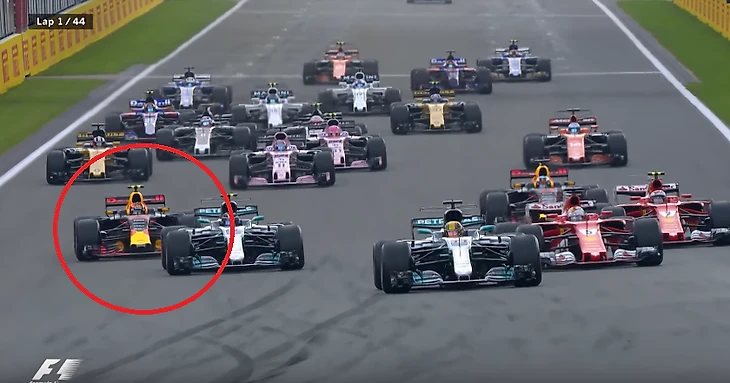 В 2017-м Макс начинал заезд 5-м и снова нырнул на внутреннюю траекторию: на этот раз обгонов не случилось, зато голландец благодаря своему маневру защитился от лучше сорвавшегося с места Даниэля Риккардо.