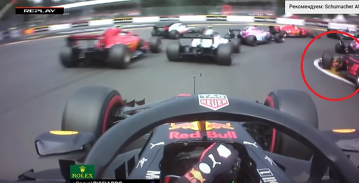 Тем не менее, Ферстаппен воспользовался преимуществами внешней траектории и обогнал несколько конкурентов — уже к концу первого круга №33 оказался 13-м.