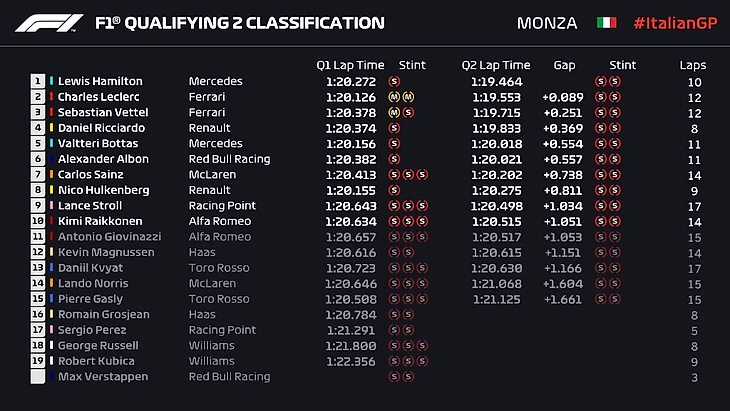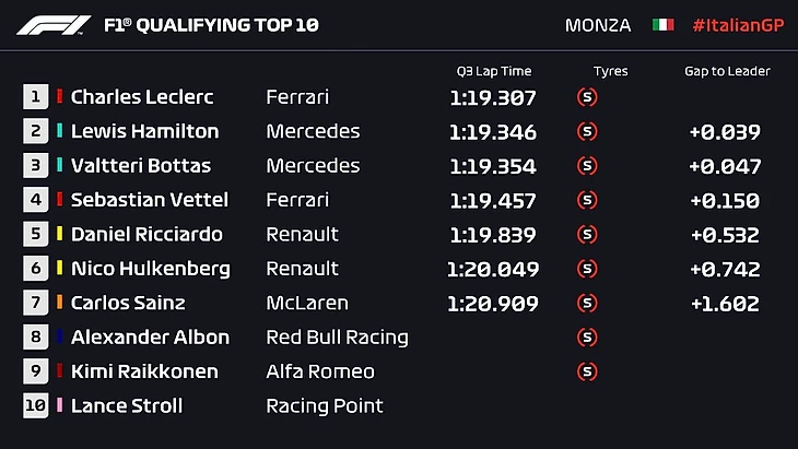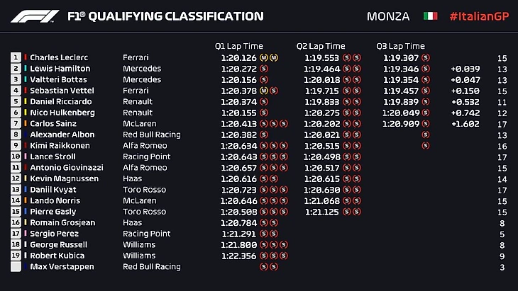Итак, Леклер на поуле, вместе с ним на первом ряду Хэмилтон. Второй ряд – Боттас и Феттель, третий – Риккардо и Хюлькенберг. Дальше Сайнс, Албон, Райкконен и Стролл.