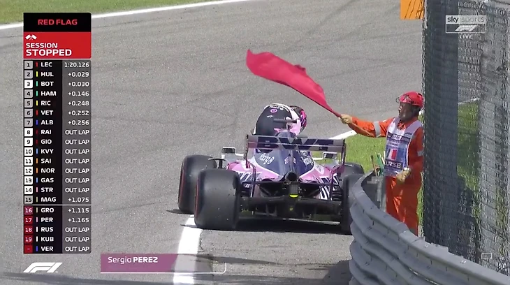 16:13 Красный флаг! Сломалась машина Переса, он остановился прямо в «Курва Гранде». Очень опасное место, пожалуй, стюарды правы.