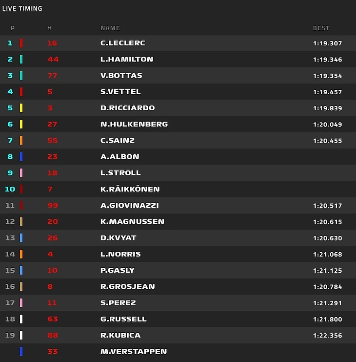 На финальную попытку пилоты опять выехали все вместе и мешали друг другу. Из-за этого на финальную попытку успели пойти только Леклер и Сайнц.
