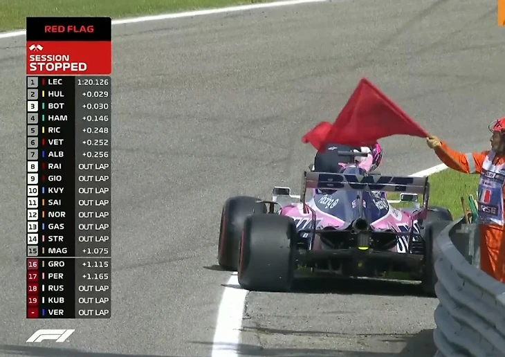 Серхио Перес, "Рейсинг Поинт", не смог закончить первый сегмент квалификации из-за отказа двигателя, чем спровоцировал красный флаг.
