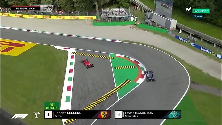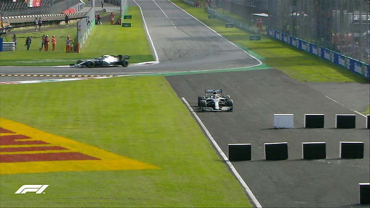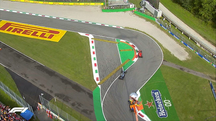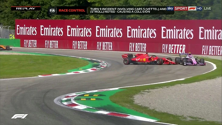 На третьем круге в борьбе с McLaren вылетает в гравий Албон, но без особых повреждений. Чего не скажешь о ситуации на 5-м круге. Себастьян Феттель второй год подряд разворачивается на этой трассе. Но если в прошлый раз раз это был поворот Variante della Roggia, то в этом году его хватило до Variante Ascari. После чего Феттель поддел Стролла, а Стролл выезжая на траекторию, вытеснил Пьера Гасли на гравий. В результате штраф получили Феттель (10 секунд Stop'n'Go) и Стролл (проезд по пит-лейн). Позже штраф дадут и Кими Райконнену, который стартовал на неправильном комплекте шин.