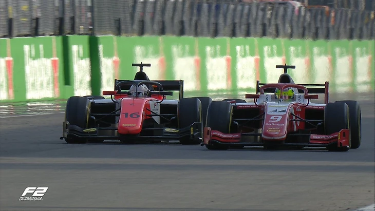 Затем у Шуми была борьба с Джеком Эйткеном, из которой пилот “Према” вышел победителем. После волны пит-стопов Шумахер переместился на третье место, и его задачей было продержаться как можно дольше на трассе, не сильно теряя в темпе относительно потенциальных лидеров. И поначалу все шло по плану. Мик даже начал атаковать идущего на такой же тактике Джордана Кинга. В последнем повороте британец немного ошибся, и Шуми сразу же пошел в атаку, отобрав у Кинга второе место.