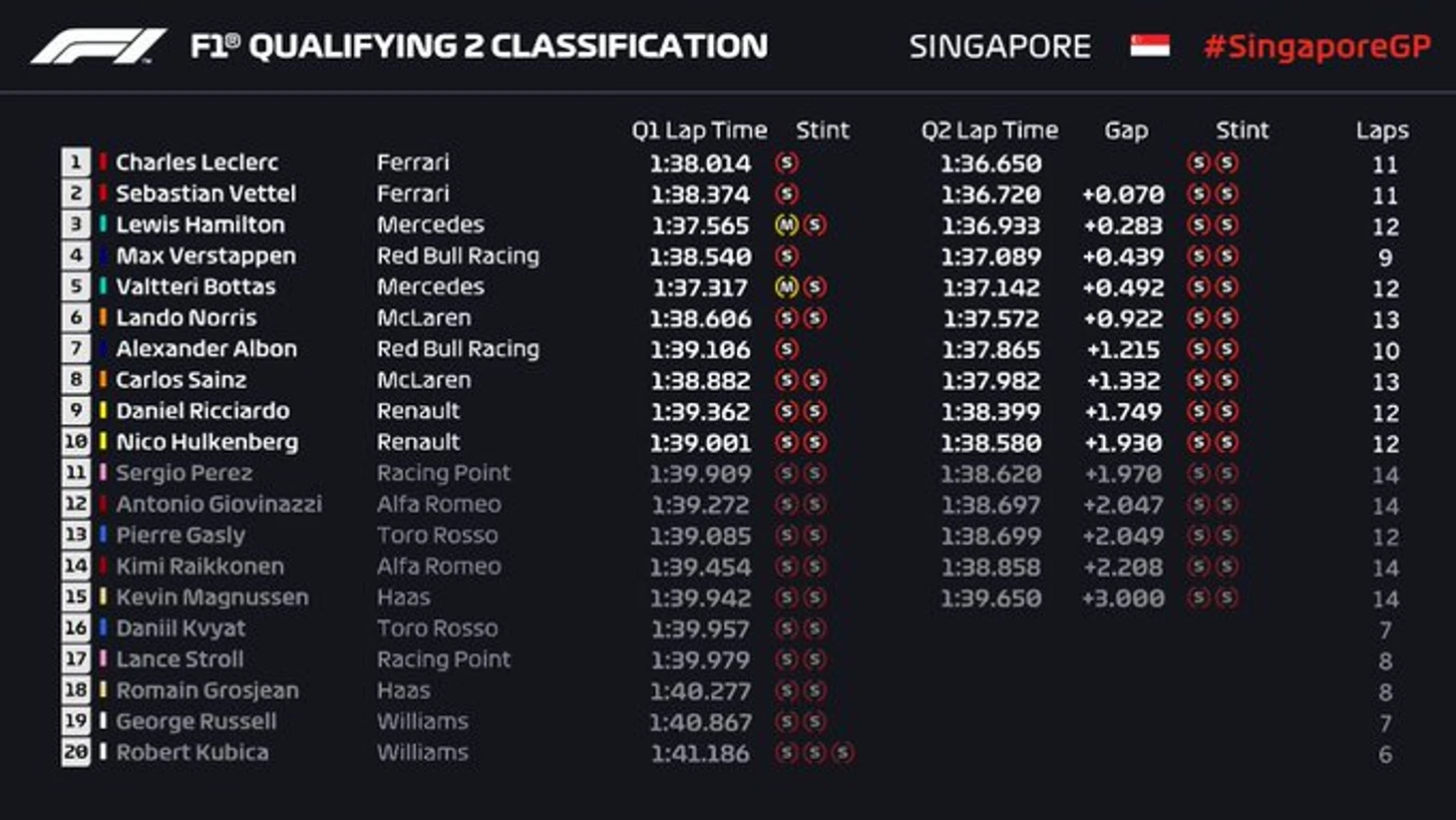 16:41Q2 окончен. Феттель поставил было лучшее время – 1.36,720, но его тут же на семь сотых улучшил Леклер. Почти на три десятые он быстрее Хэмилтона.