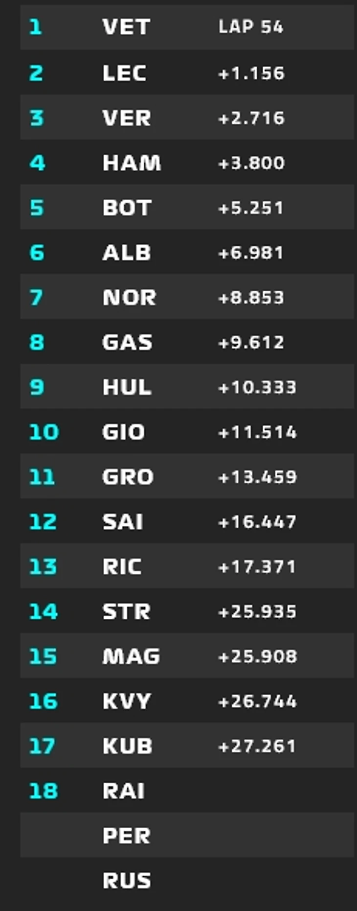В группе лидеров без изменений: Феттель, Леклер, Ферстаппен, два «Мерседеса».
