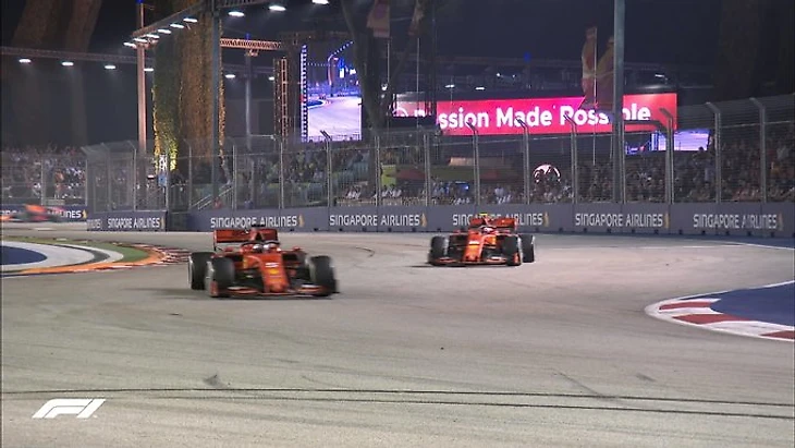 Как только в Ред Булл увидели возможность выехать перед Хаасом Грожана, они на 19-м круге зазвали на пит-стоп Макса Ферстаппена. И это ключевой, как оказалось, момент гонки. Феррари сориентировались в последние секунды, окликнув Феттеля по радио, дабы он не потерял позицию относительно Ферстаппена. Пит-стоп у Сэба получился так себе – 3 секунды. Но Феттель взял быка за рога и выдал такой круг по чистой трассе, что Леклер, опережавший напарника более, чем на 3,5 секунды (плюс еще почти на 0,6 секунды быстрее прошел его пит-стоп) только и увидел, что корму машины №5 перед собой, когда выезжал от механиков кругом спустя.