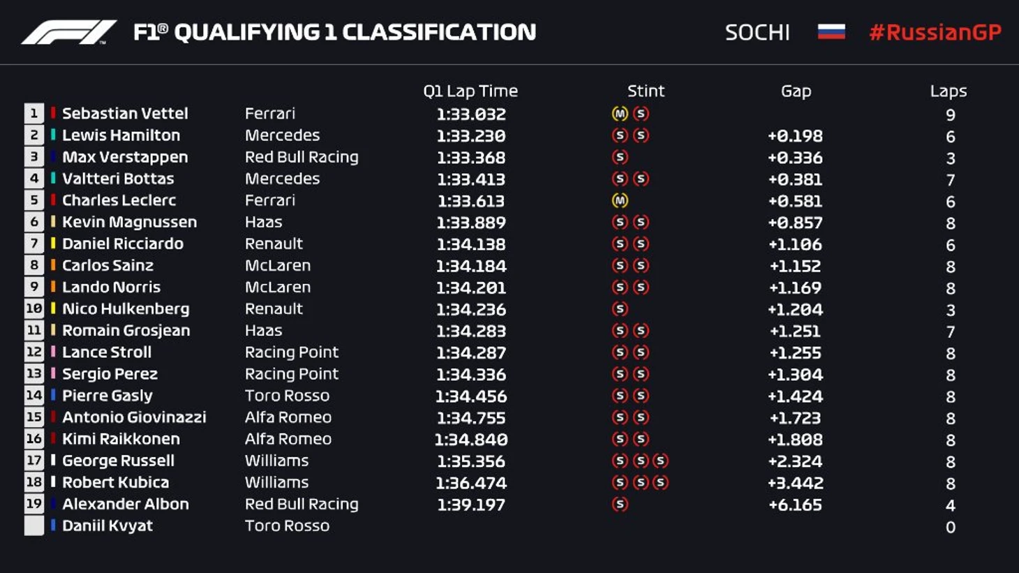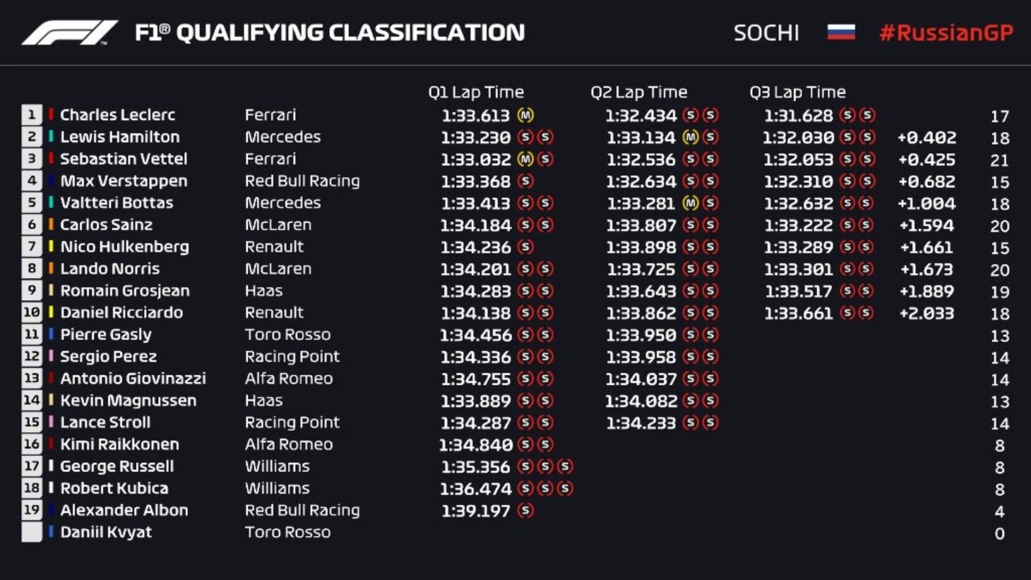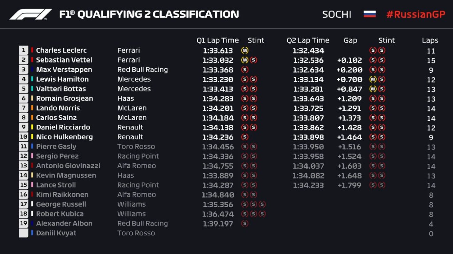 16:08 ЛЕКЛЕР НА ПОУЛЕ! Два лучших сектора и лишь третий не удался, но все равно хватило! Хэмилтон второй: Феттель проехал плохой круг с помарками и не смог сильно улучшить! Ферстаппен четвертый, так как Боттас снова ошибся и даже не закончил круг! Дальше Сайнс, Хюлькенберг, Норрис, Грожан и Риккардо.