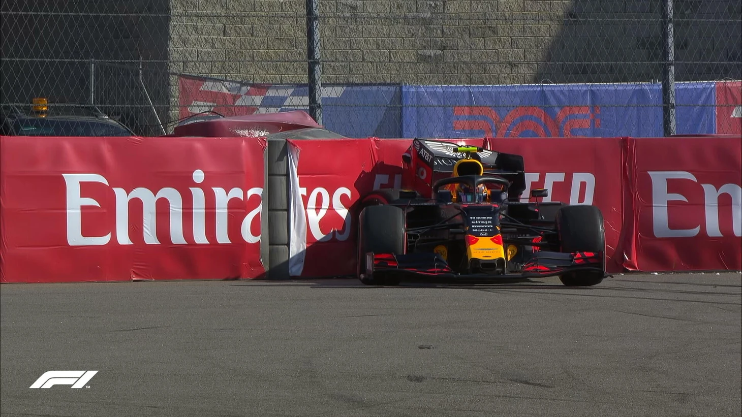 15:13 Алекс потерял контроль над машиной в 13-м повороте и ударился задней частью об отбойник. Заднее антикрыло под замену и возможно, коробку передач тоже.