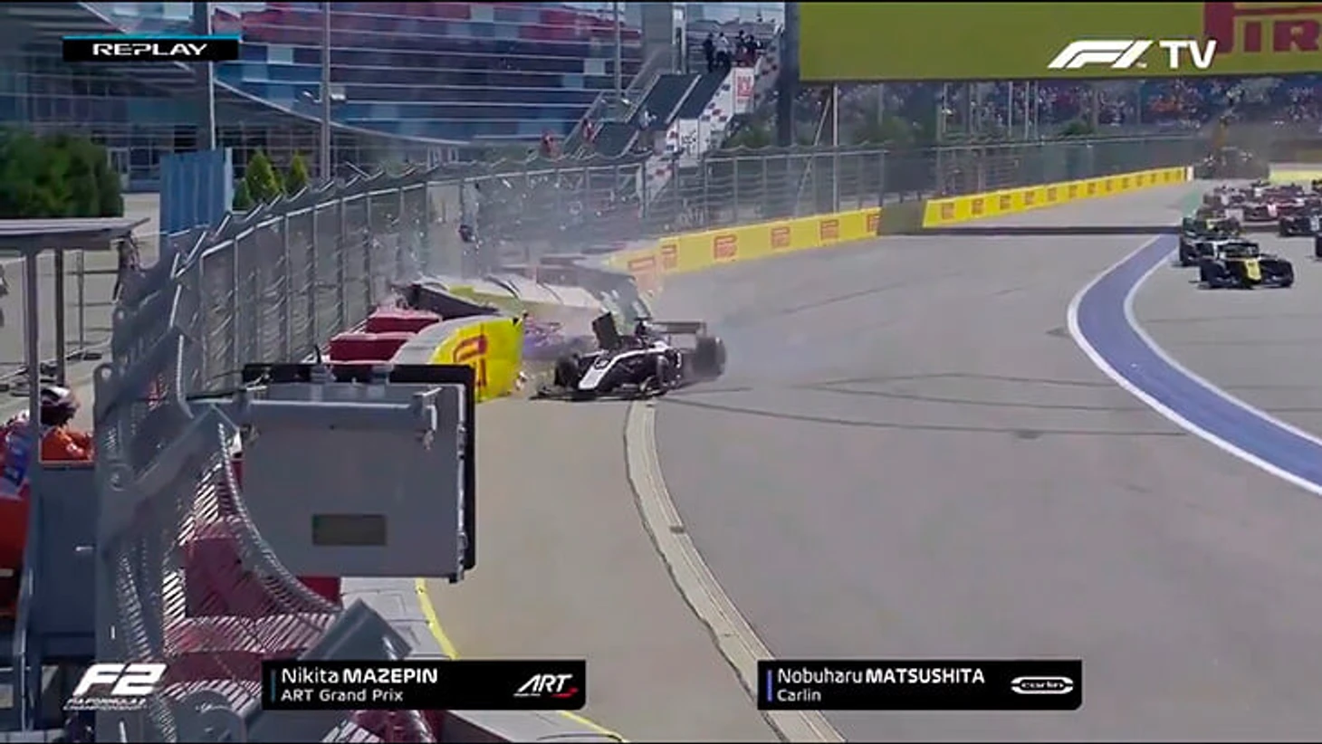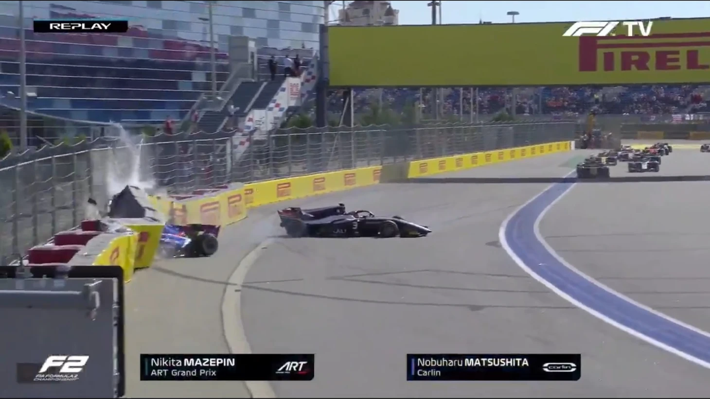 После этого неуправляемая машина россиянина врезалась в болид Нобухару Мацуситы и отправила его в стену. А затем в него врезался и Мазепин. И винить в этой аварии можно только Никиту.