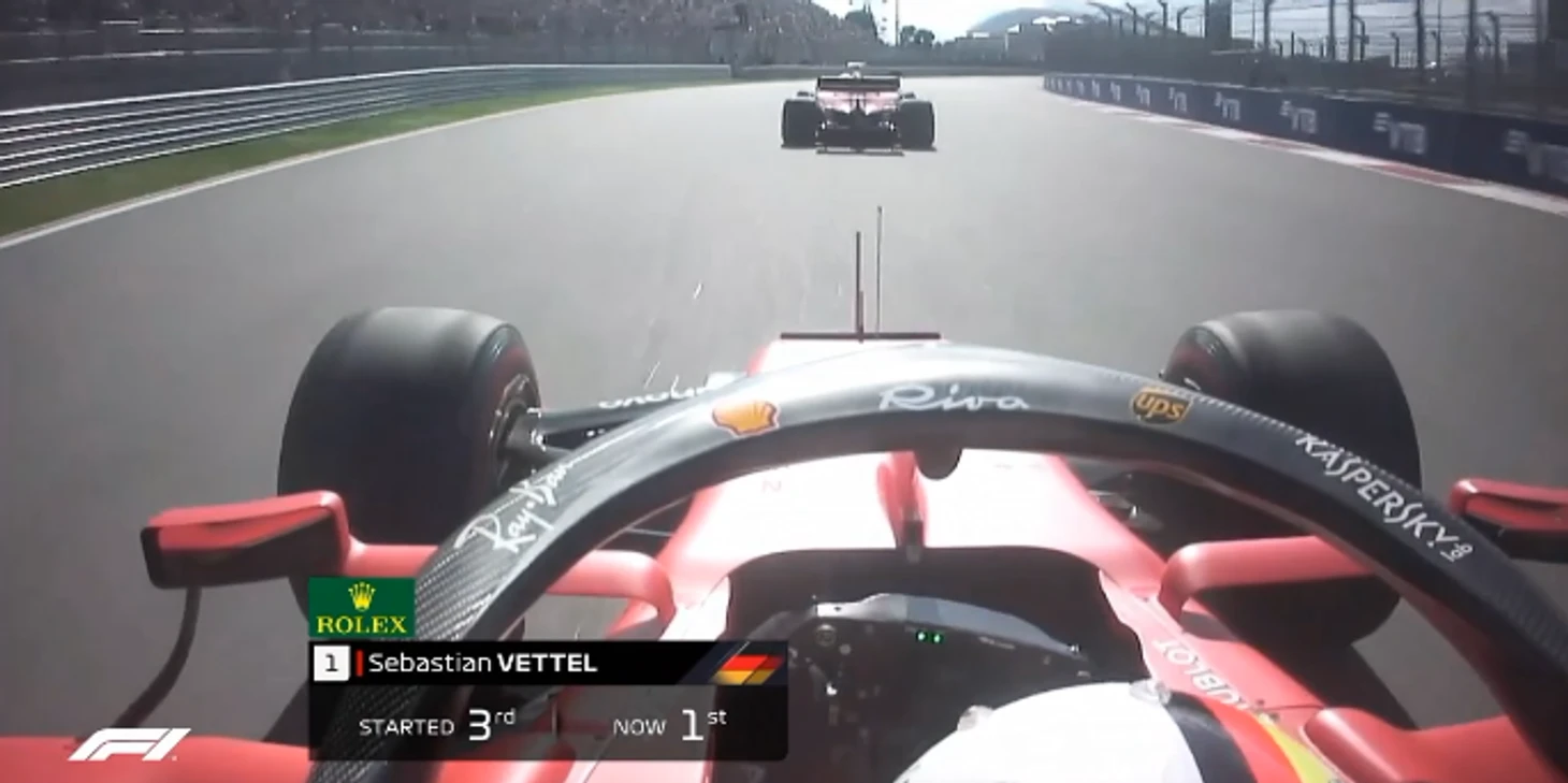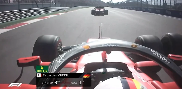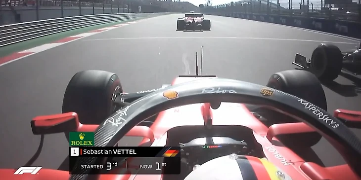 Теперь же Скудерия решила стратегически обыграть «Мерседес», используя тот же эффект: по договоренности между пилотами, Леклер предоставил Феттелю слипстрим и не боролся с напарником в первом повороте, чтобы помочь ему обойти Хэмилтона. В итоге же Себ возглавил гонку после второго поворота.