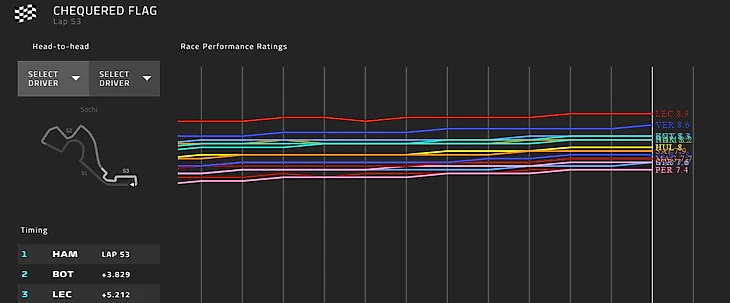 На официальном сайте «Формулы-1» в разделе лайвтайминга на странице «выступлений» появились оценки пилотам за Гран-при России, основанные на данных телеметрии.