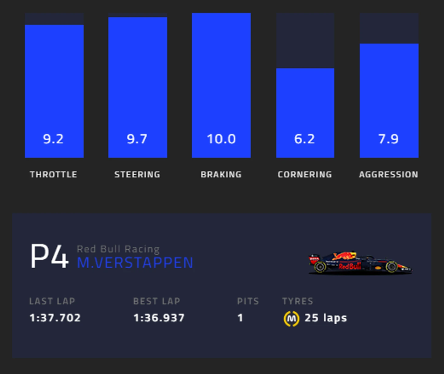 Второе место досталось пилоту «Ред Булл» Максу Ферстаппену. Его оценка в 8,6 сложилась из 9,2 за работу с педалью газа, 9,7 за работу рулем, 10 за работу на торможениях, 6,2 за прохождение поворотов и 7,9 за «агрессивность». Макс финишировал четвертым.