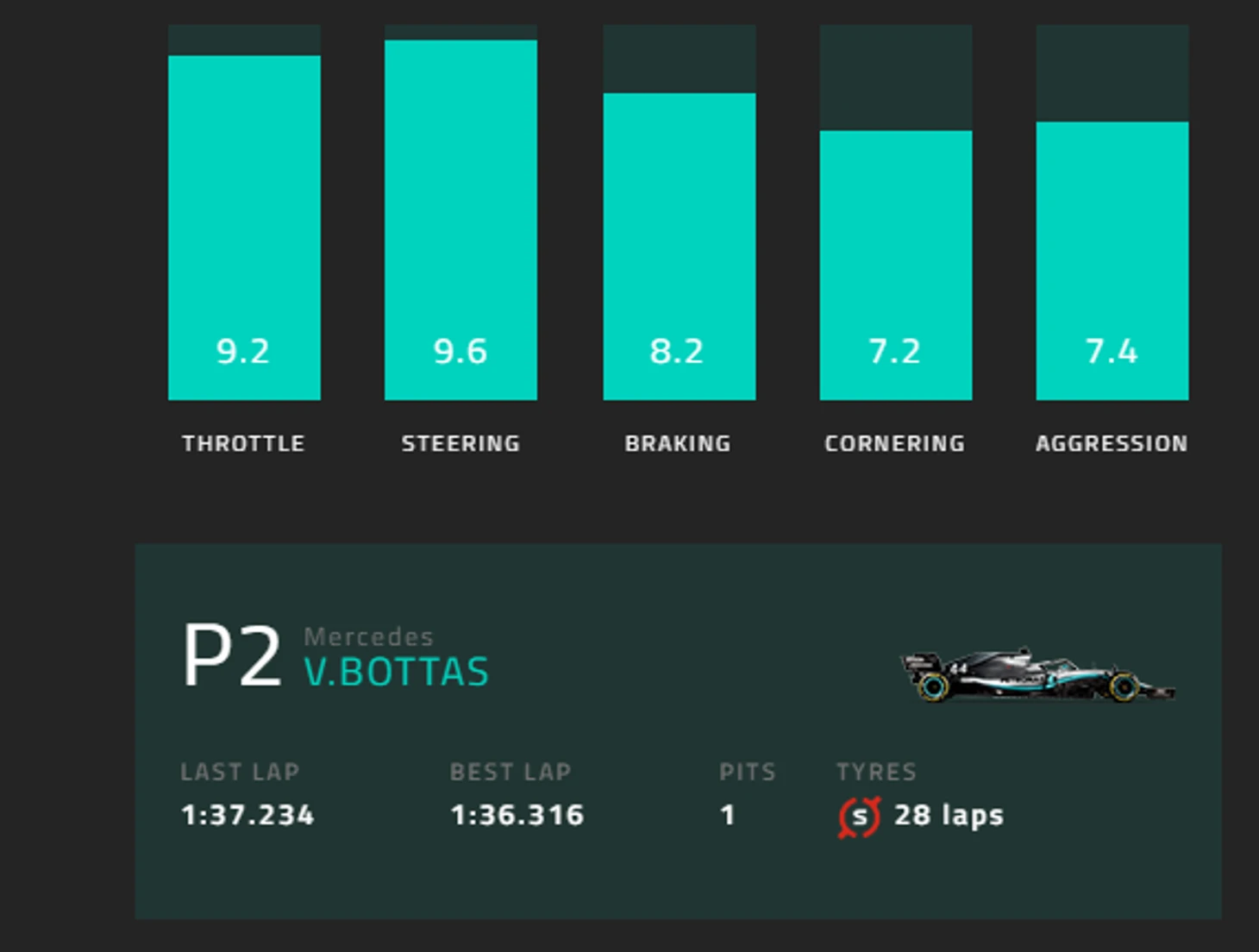 Боттас получил 8,3 за 9,2 за работу с педалью газа, 9,6 за работу рулем, 8,2 за работу на торможениях, 7,2 за прохождение поворотов и 7,4 за «агрессивность». Валттери закончил гонку вторым.