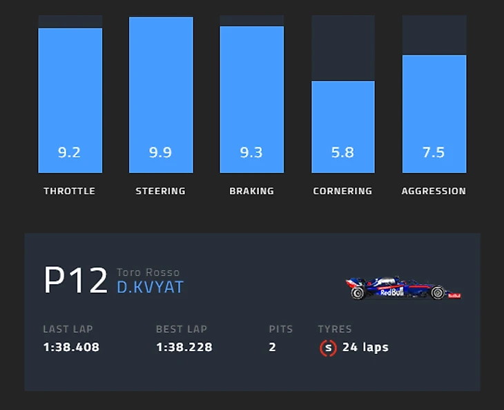 Оценка россиянина в 8,3 сложилась из 9,2 за работу с педалью газа, 9,9 (лучшая оценка в пелотоне) за работу рулем, 9,3 за работу на торможениях, 5,8 за прохождение поворотов и 7,5 за «агрессивность». Даниил стартовал с последнего ряда и добрался до финиша 12-м.