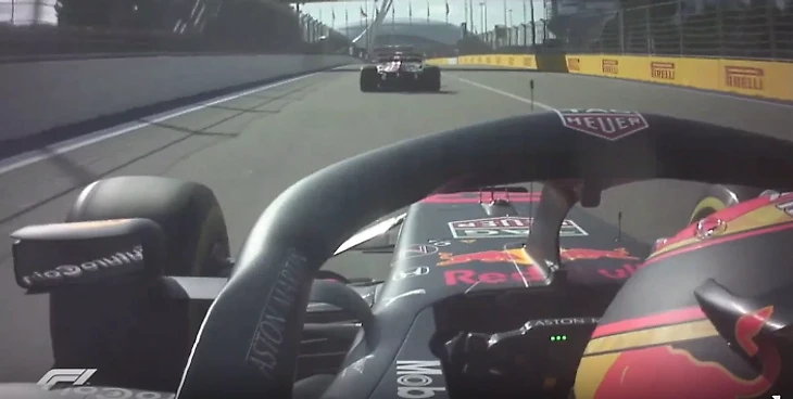 Видит, что впереди Квят, который сейчас начнет заворачивать на апекс.